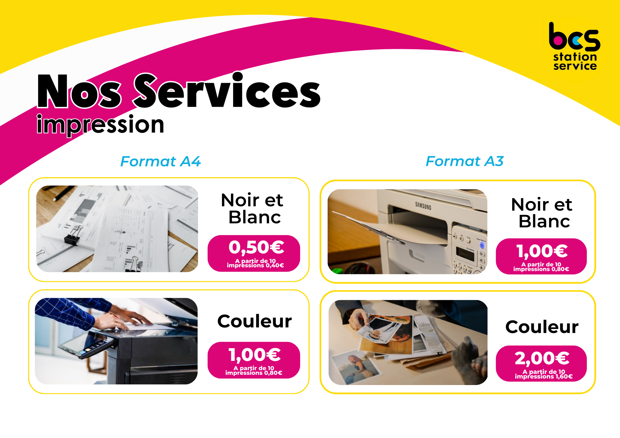 Formats disponibles : A4 à A3, impressions recto ou recto-verso.